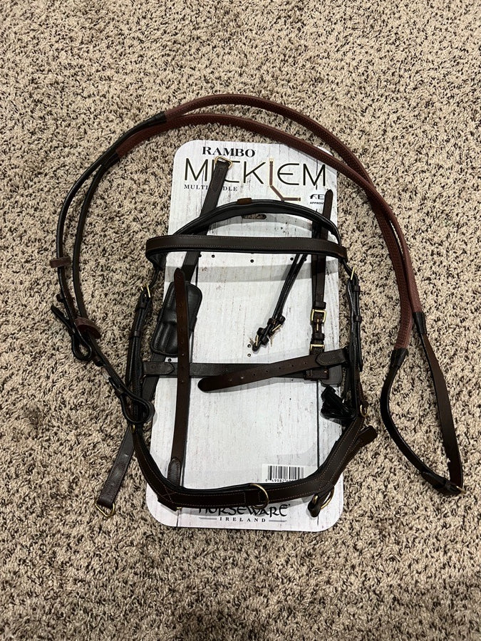 The Rambo Micklem Multibridle is a unique bridle that is designed to comfortably fit the shape of the horse's skull, avoiding pressure on sensitive areas.