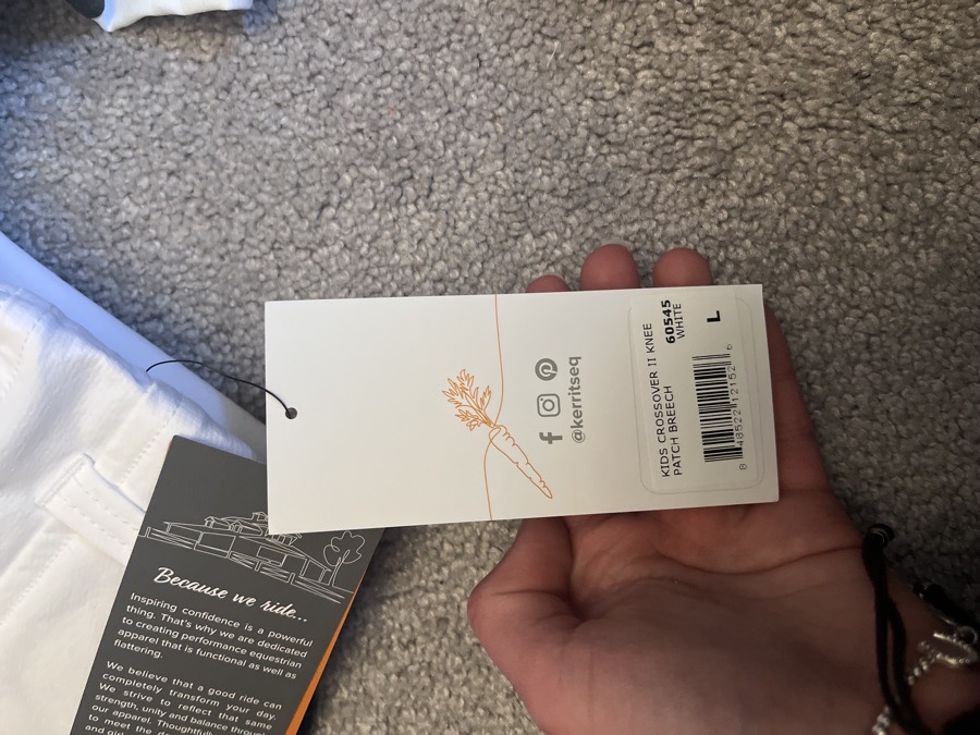Brand new with tags, XS white Saddle and Canter Breeches. Full seat with diamond details