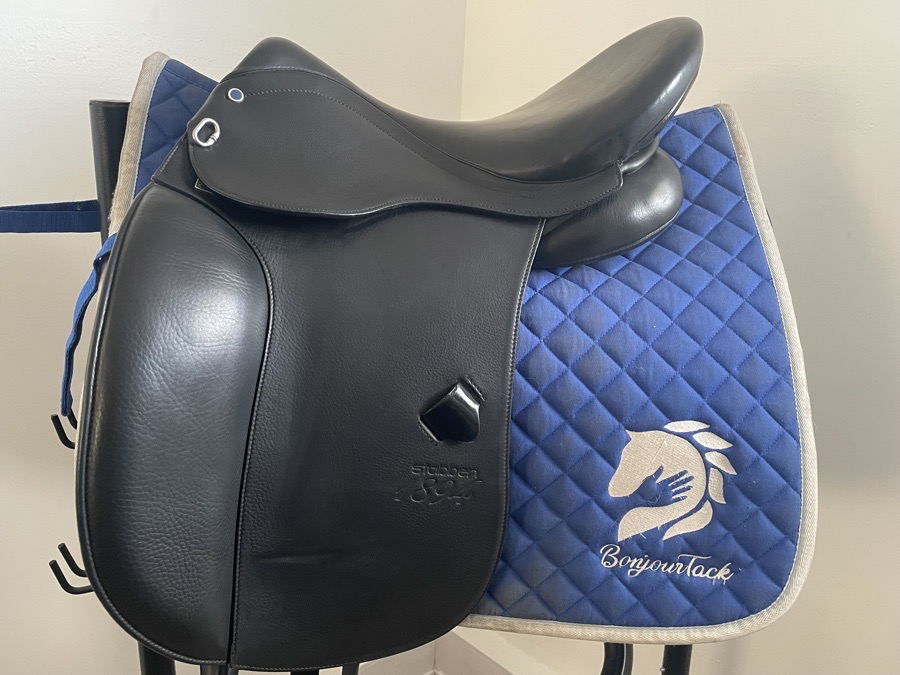 18 Devoucoux saddle Biarritz semi deep seat 2A Flaps measuring 13.75” from stirrup bar to bottom and 13.75” across 4.5” dot to dot 4 fingers channel measurement Front and rear blocks Weight 13.2 lbs Serial number: Biarritz 354 11 Arcade normale 18 2A 3PB PX5 PX4B10